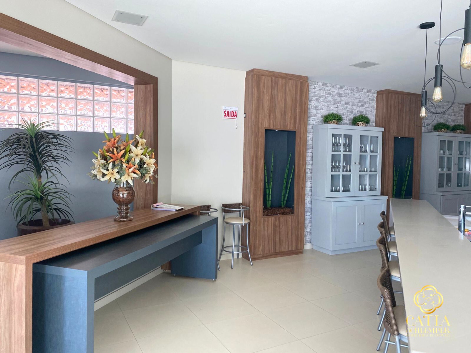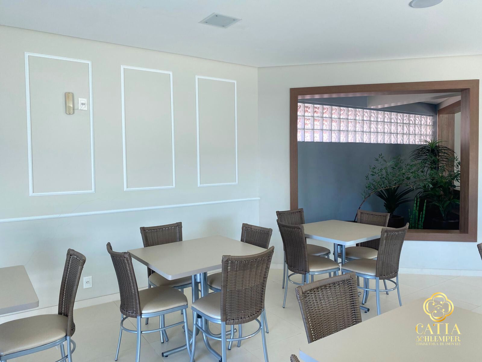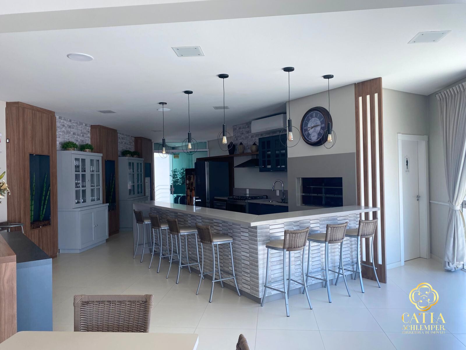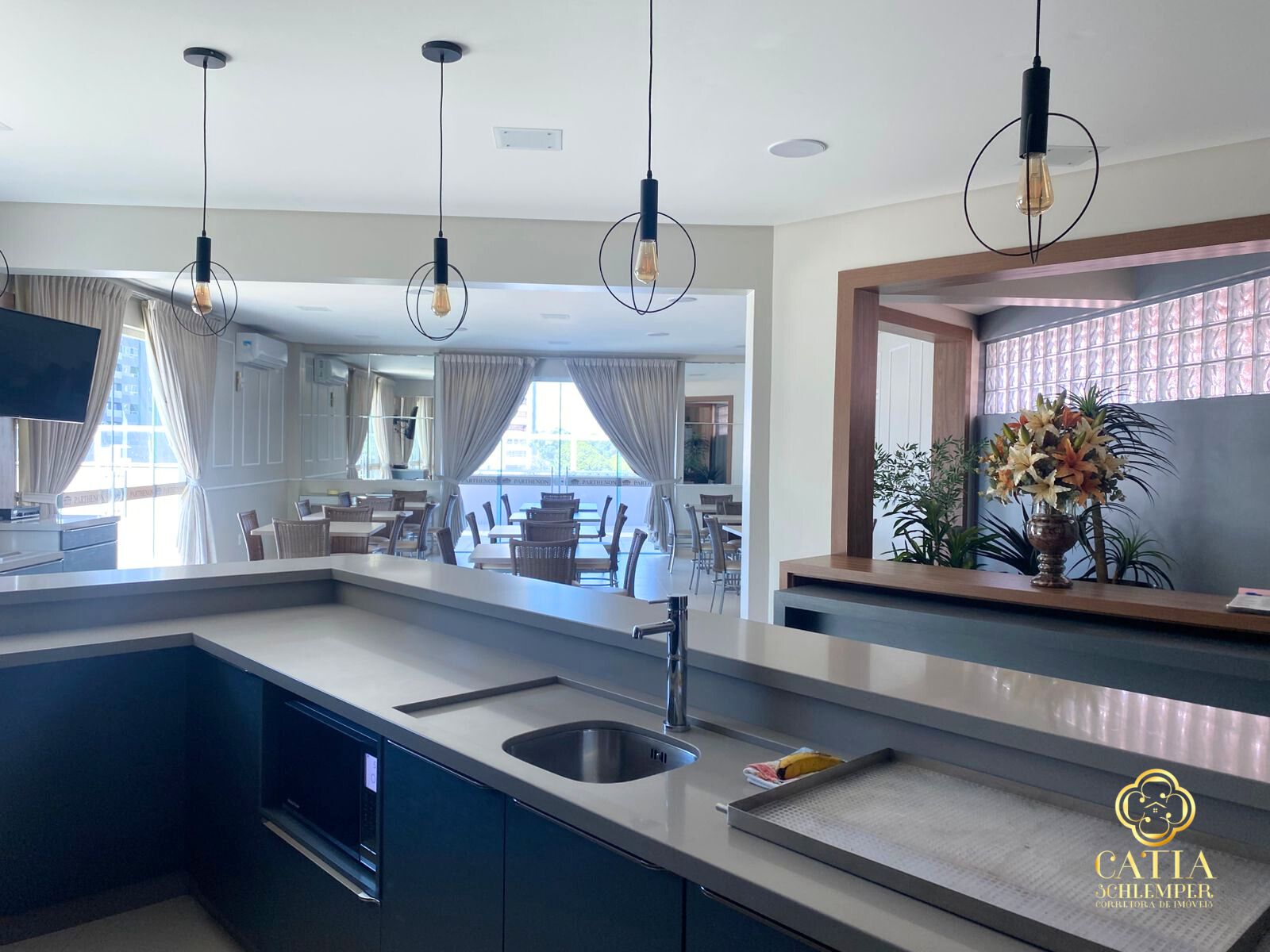 • Living integrado com sala de estar/TV, sala de jantar e cozinha.